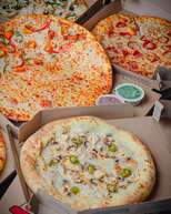 تكس مكس صلصة البيتزا، وموزاريلا، وبصل، وفلفل أخضر، وزيتون أسود، وصدور دجاج مشوية، وهلابينو، وأوريجانو